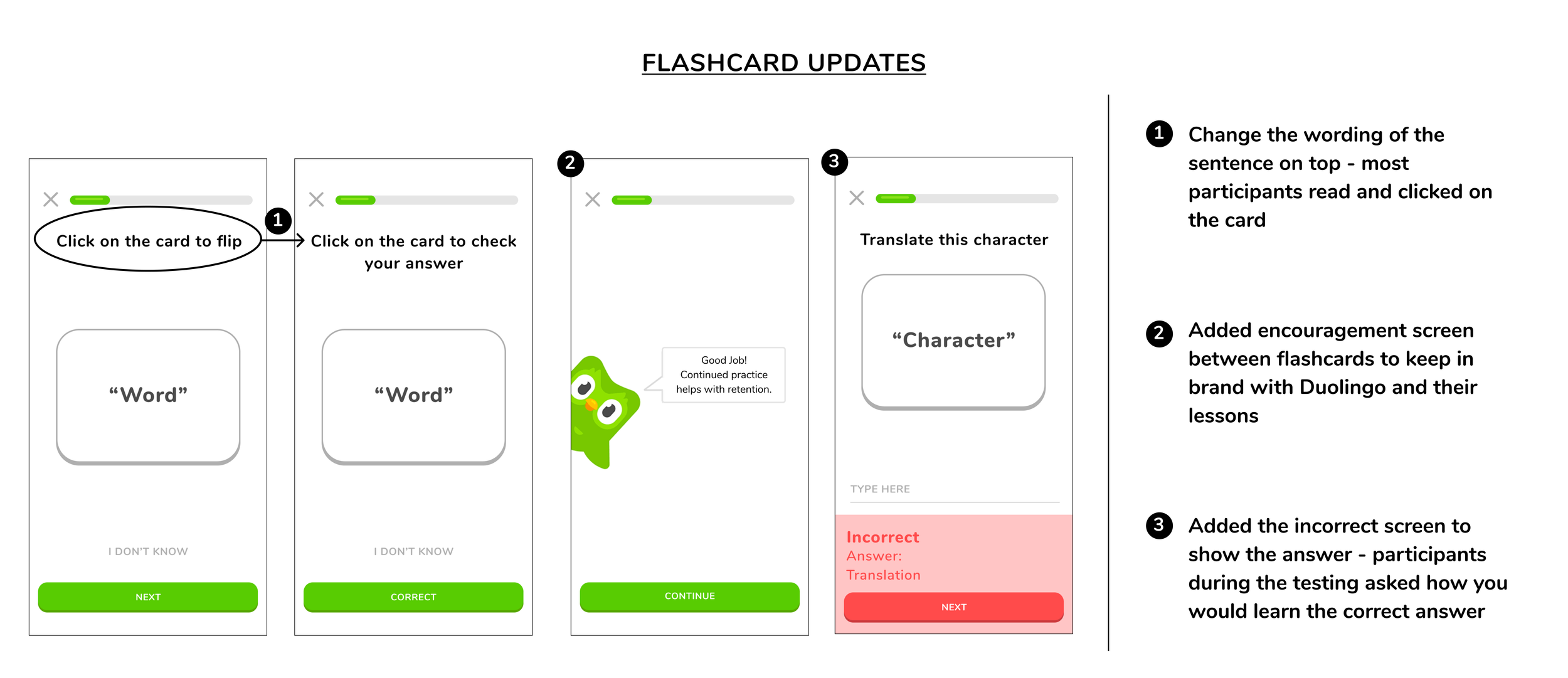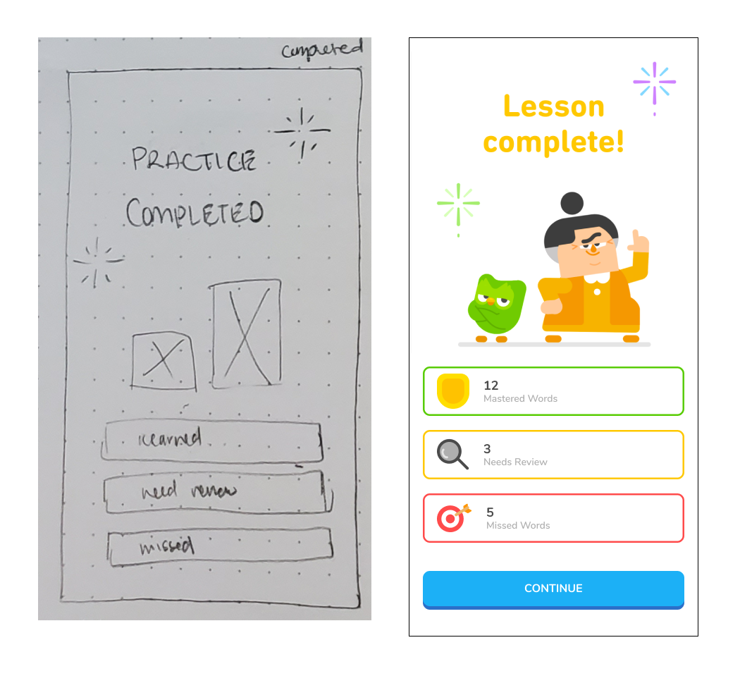 Before any sketches were started, I reviewed Duolingo design guideline, information architecture and user flow to get a better understand of how I would integrate the flashcard feature within its current design.