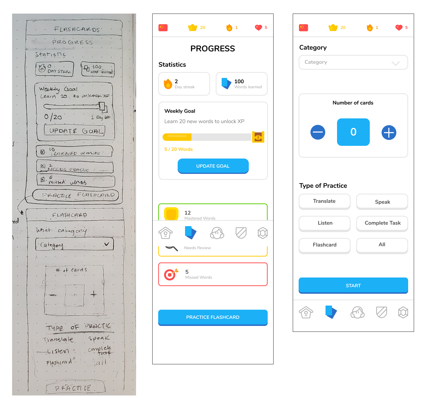For the rest of the screens these were new additions needed for the flashcard features based on other screens seen throughout the lessons.