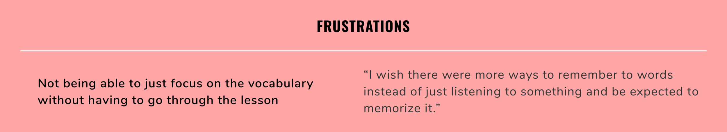 I conducted one-on-one interviews with those whose were language learners to learn about their current language journey and to learn about their needs, motivations and frustrations.