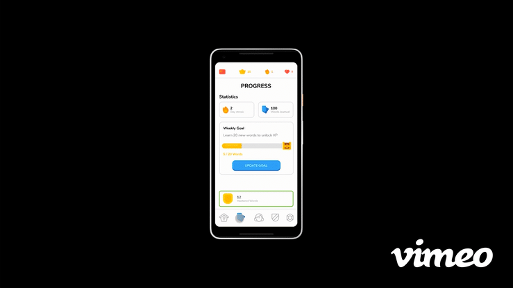 Progress tab provides the user with how many words they have mastered, need practice or missed with the ability to view those categories. There is also a goal bar that the user and shows a reward system if the user completes their goal.