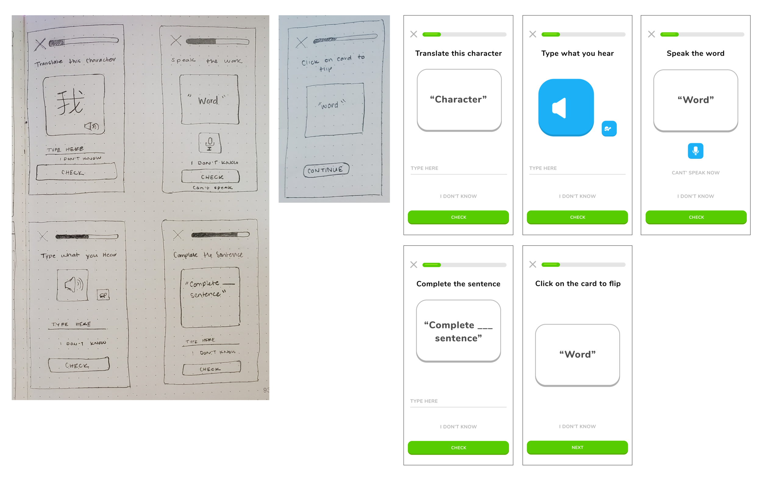 Once I had an understanding of the layout in Duolingo, I started on my sketches to address a few problems I had discovered through the research and interviews.
