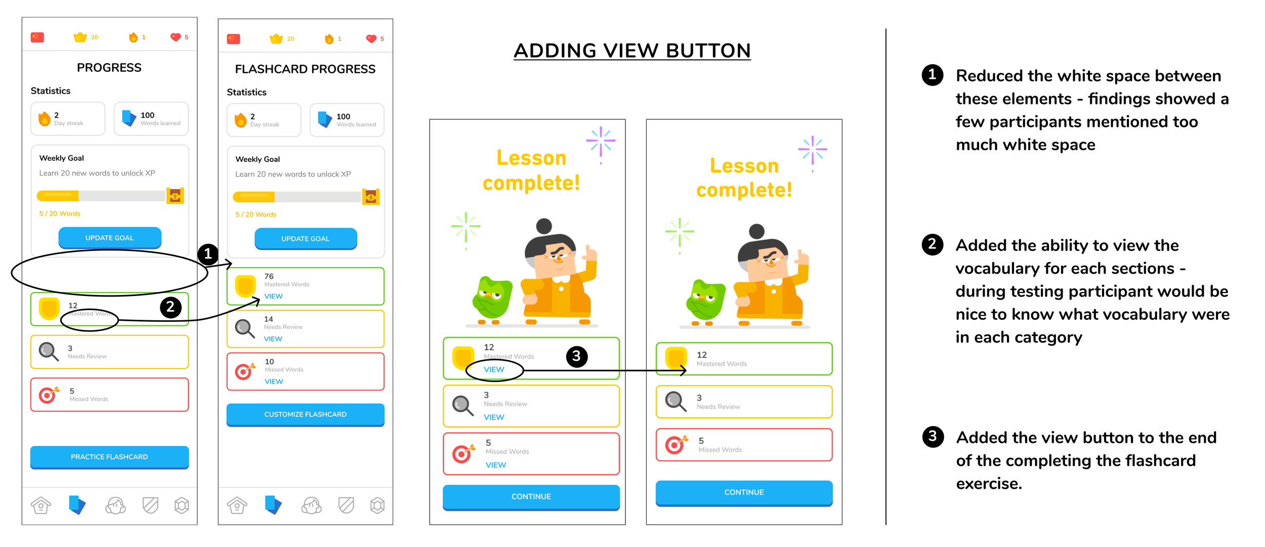 Tinycard was a flashcard and study companion app to Duolingo but it was sunsetted in 2020. Duolingo currently does not provide a way to review vocabulary outside of the lesson unless they reenter the lesson again to review on their own. Even if the user does enter the lesson some vocabulary repeats more often than others. Adding a flashcard feature within Duolingo will solve this problem by allowing the users to review the new vocabulary from each lesson in addition to allowing the user to have a limited customization of the deck sets.
